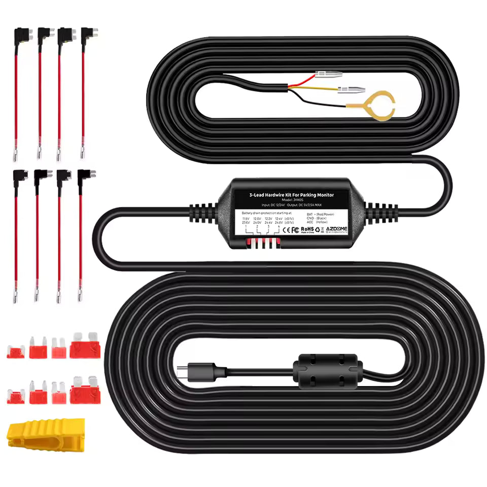 The AZDOME JYX05 Hardwire Kit is expertly engineered to provide low voltage protection for select dash camera models including M27, M560, M330, PG19X, M580, and D100. Designed with precision, this kit enables a seamless connection to your vehicle’s fuse box, delivering a consistent and reliable power supply while safeguarding your car battery from drainage. By intelligently monitoring voltage levels, it prevents excessive power consumption, ensuring that both your dash cam and vehicle battery maintain optimal performance and longevity. This discreet and streamlined installation solution is crafted to support advanced parking monitoring features, allowing your camera to operate continuously even when your vehicle is parked. The low voltage protection enhances convenience by automatically disconnecting power when battery levels drop below a safe threshold, giving you peace of mind against unexpected power loss. Crafted for vehicle owners who demand sophistication and reliability, the AZDOME JYX05 Hardwire Kit blends functionality with elegant design to integrate seamlessly into your car’s electrical system. Elevate your vehicle’s security capabilities with this smart, durable hardwire kit, engineered to provide sustained operation and protect your investment over time.